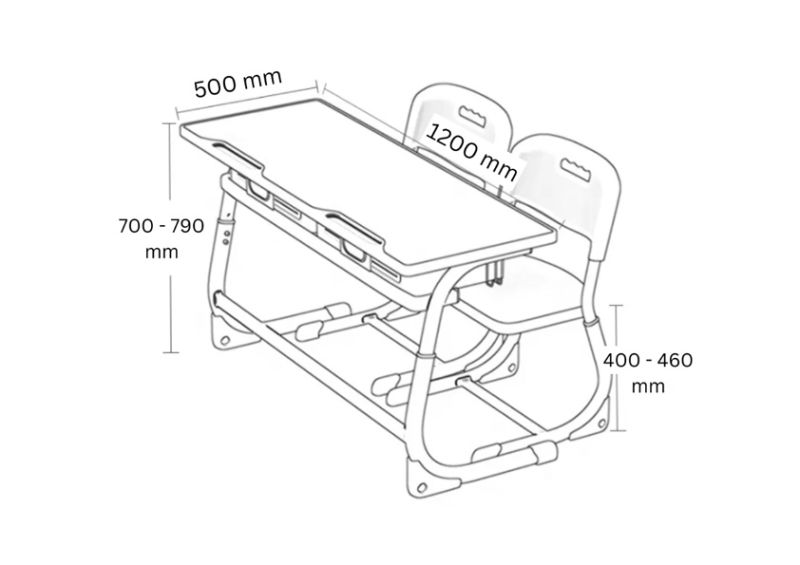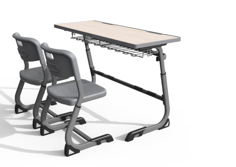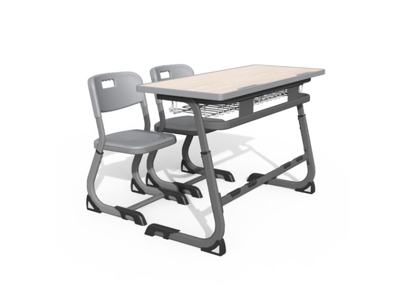 Комплектът включва бюро с регулируема височина и два стола, което го прави идеално решение както за училищни зали, така и за домашна учебна среда.