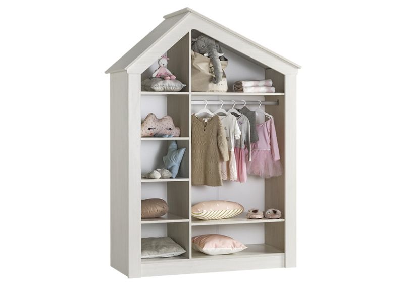 Гардеробът разполага с 6 просторни рафта, 1 лост за дрехи и вградено осветление, което осигурява удобство при подреждане и използване през всяко време на деня. Механизмите за плавно затваряне гарантират тиха и безопасна употреба, подходяща за детски помещения.