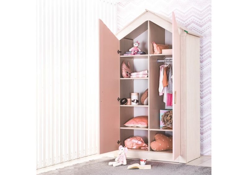 Част от серия PINK HEAVEN, този двукрилен гардероб допълва чудесно интериора на детската стая с нежна естетика и висока функционалност.