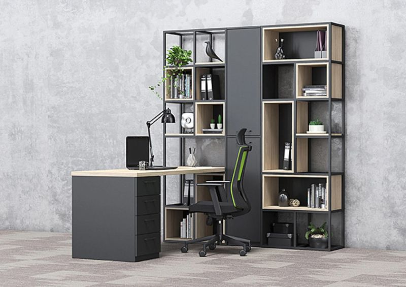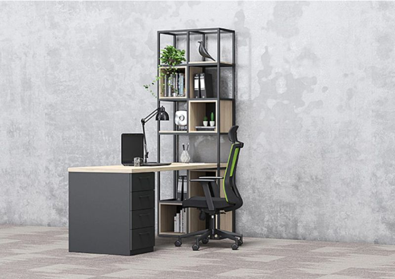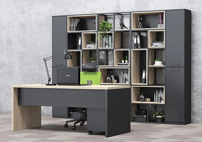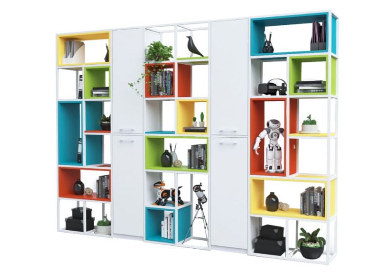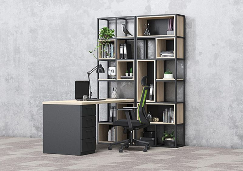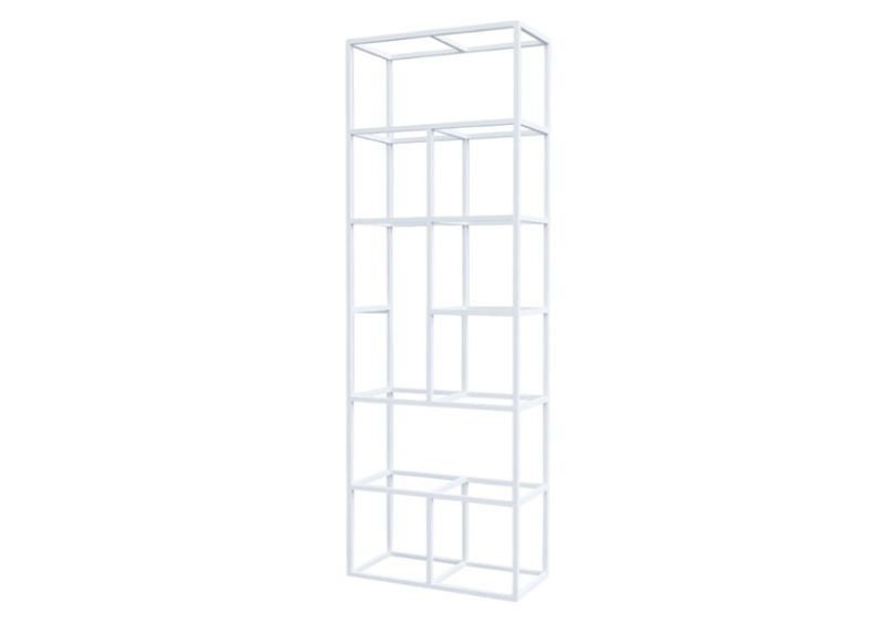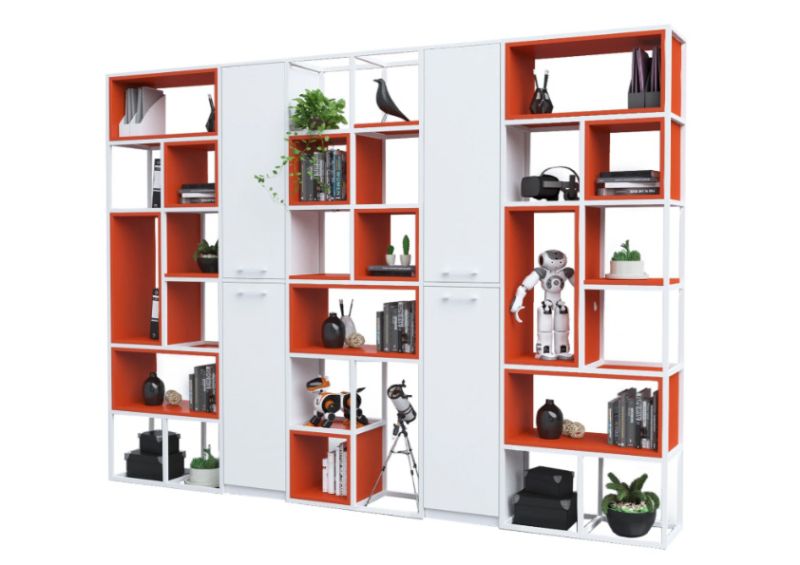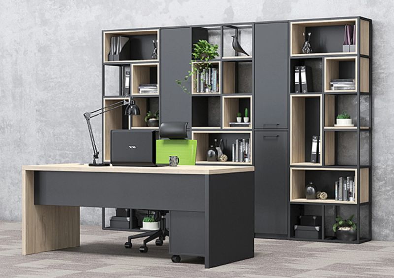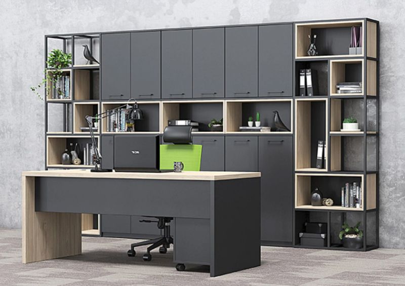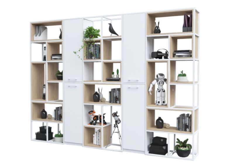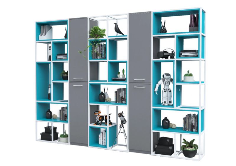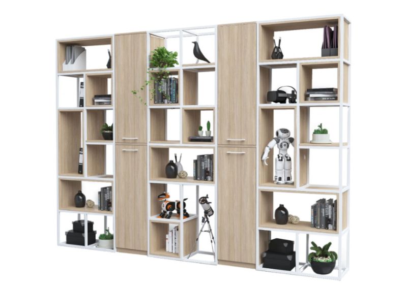 Конструкцията е изработена от прахово боядисан метал със сечение 20 × 20 мм, което гарантира здравина, устойчивост и дълъг експлоатационен живот. Системата позволява свободна конфигурация – шкафове, рафтове и кутии се избират допълнително, според конкретните нужди и стила на пространството.