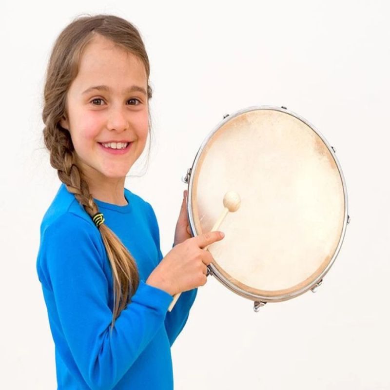Комплектът включва барабан с естествена кожа с диаметър 21 см и палка, идеален за музикални занимания, обучение по ритъм и сценични изяви. Барабанът може да бъде настроен според предпочитания звук, като предлага автентично музикално изживяване.