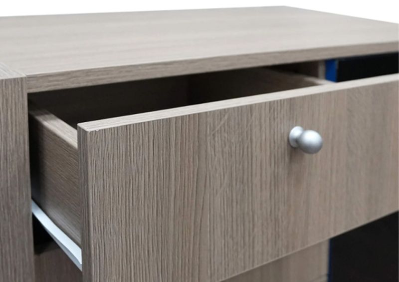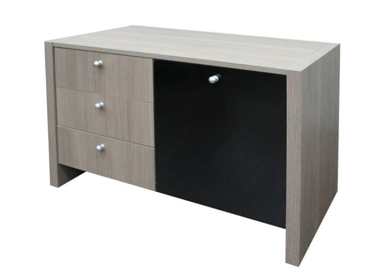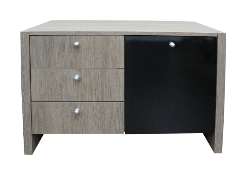 Шкафът е изработен от ПДЧ с меламиново покритие, което осигурява лесна поддръжка, устойчивост при ежедневна употреба и дълъг експлоатационен живот. Комбинацията от три чекмеджета и вратичка предоставя удобна организация и бърз достъп до съдържанието.