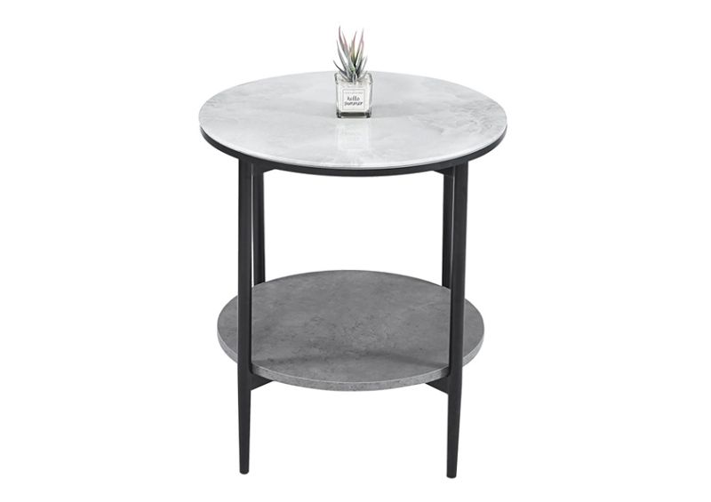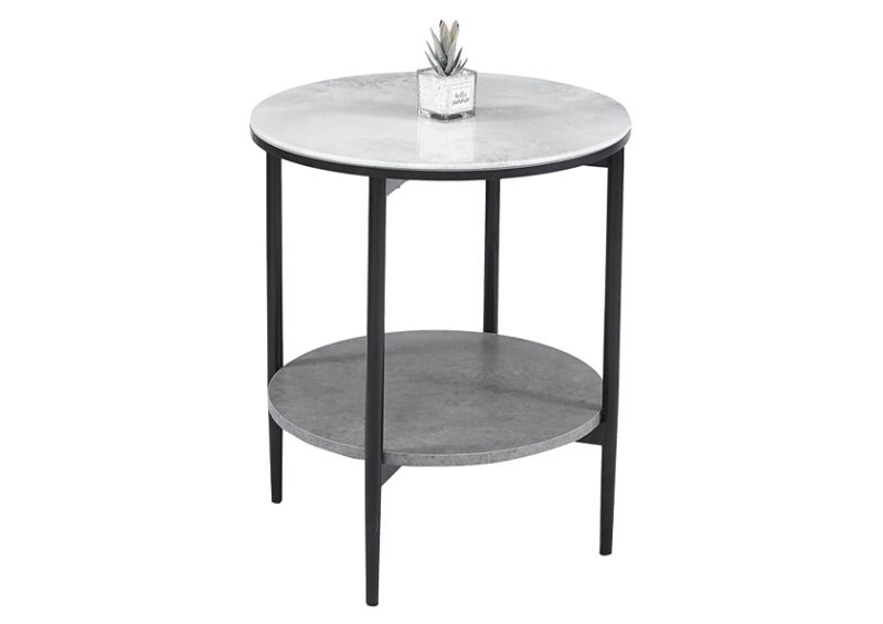 Стабилната прахово боядисана метална основа гарантира устойчивост и здравина, а двата плота с дебелина 20 мм осигуряват надеждност и функционалност. Компактният диаметър от 50 см и височина 55 см я правят перфектна като странична масичка до диван, декоративна маса или помощна холна маса.